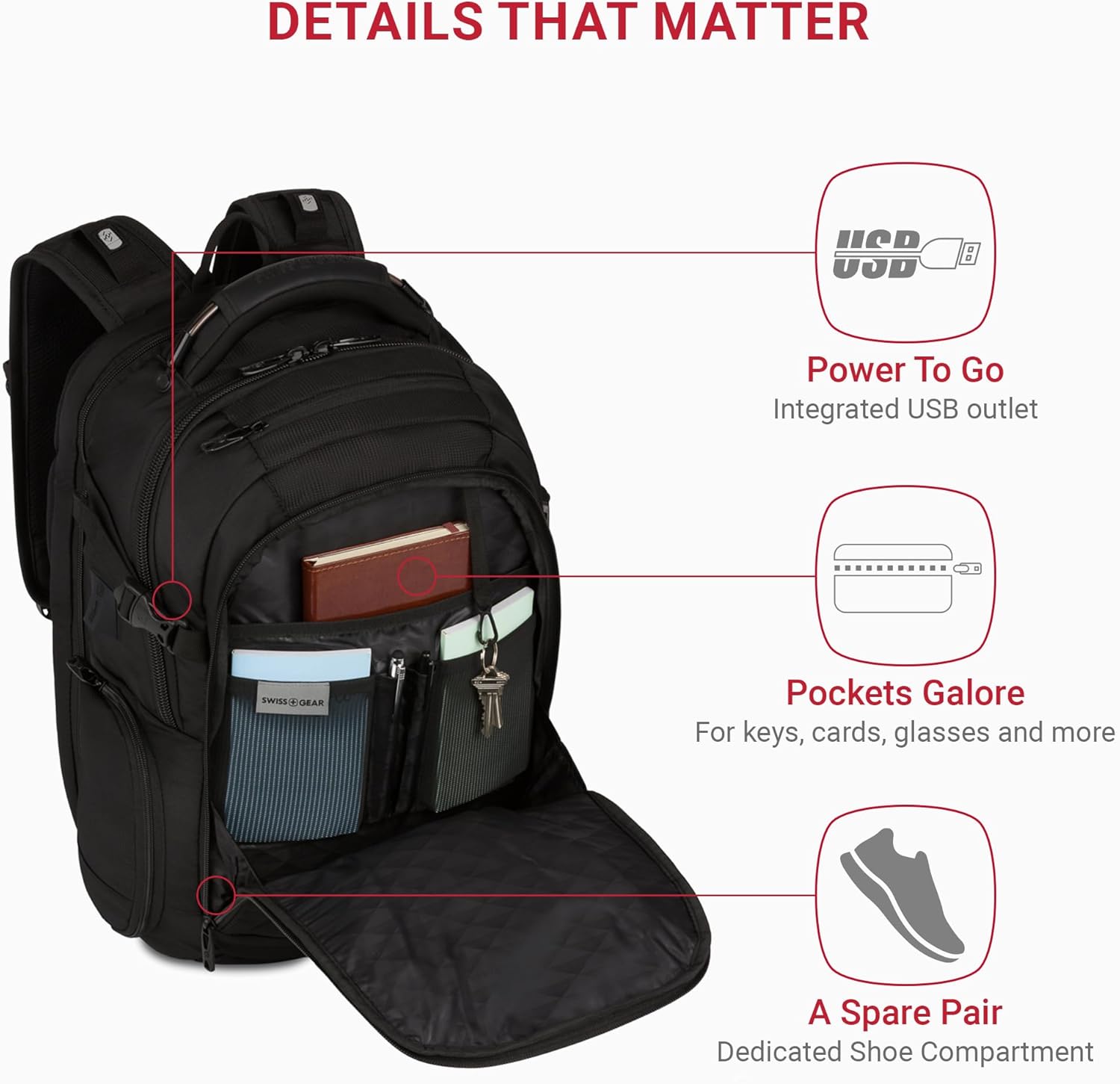Equipped with a built-in USB port, this backpack allows you to stay connected on the go by charging your devices conveniently. The dedicated shoe compartment ensures that your footwear stays separate from your other belongings, keeping everything organized and clean. Multiple organizer pockets help you keep your accessories and smaller items in order, so you can easily find what you need when you need it.